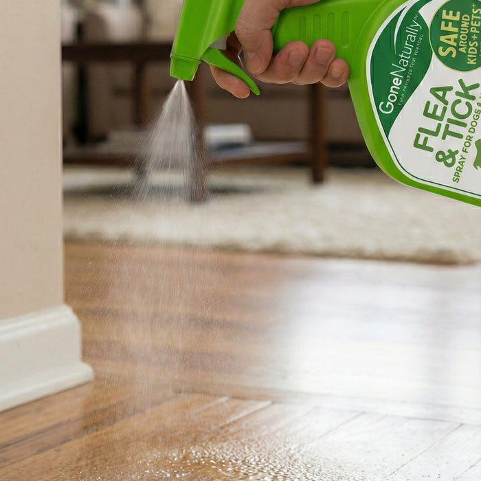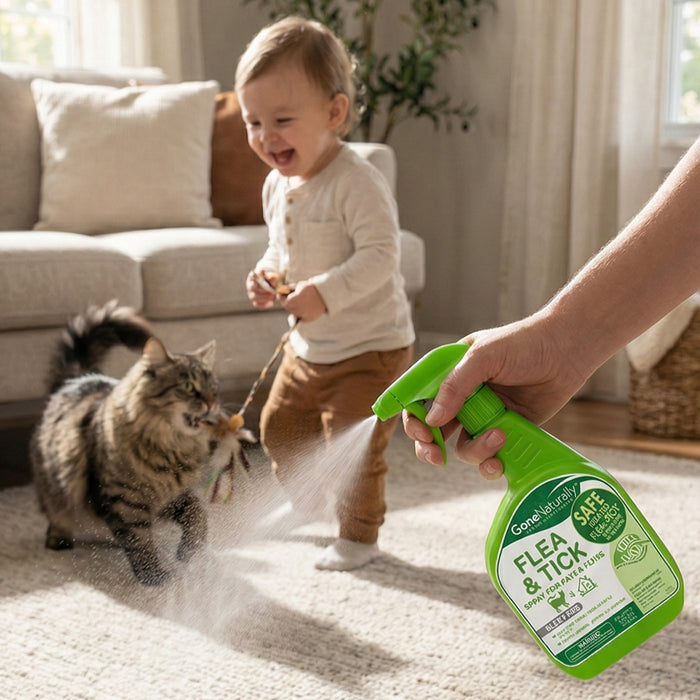 Fleas hide in more than just fur—they thrive in your carpets and bedding. GoneNaturally Flea and Tick Spray eliminates pests by contact. Just spray daily to kill bugs, eggs, and larvae, breaking the reproduction cycle without harsh chemicals or essential oils.